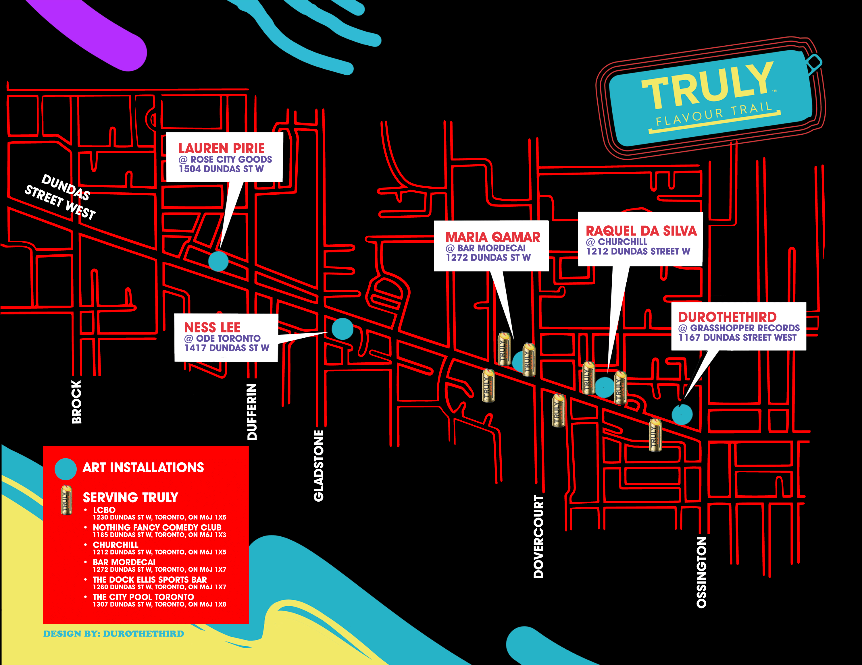 Truly Hard Seltzer, one of North America’s most beloved hard seltzer brands, has finally arrived in Ontario. To celebrate, we’ve created the Truly Flavour Trail, a free, walkable, outdoor art experience through one of the city’s most lively neighbourhoods: Little Portugal. We have commissioned five local artists to create original pieces of art which will be placed along Dundas West between Lansdowne and Ossington from